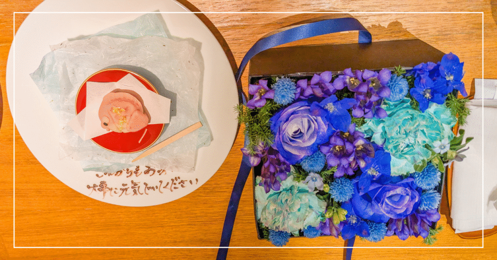 実は予約当時からスタッフの方へ還暦祝いであることを伝えておりました。その際花束、ケーキのご提案をいただきお願いしておりました。