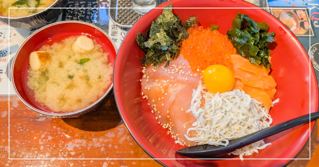 しらす、サーモン、マグロが並んだ海鮮丼を頂きました。以前神奈川 江ノ島に訪れた際にも「しらす丼」が掲げられたお店を見かけましたが、関東近辺では有名のようですね。