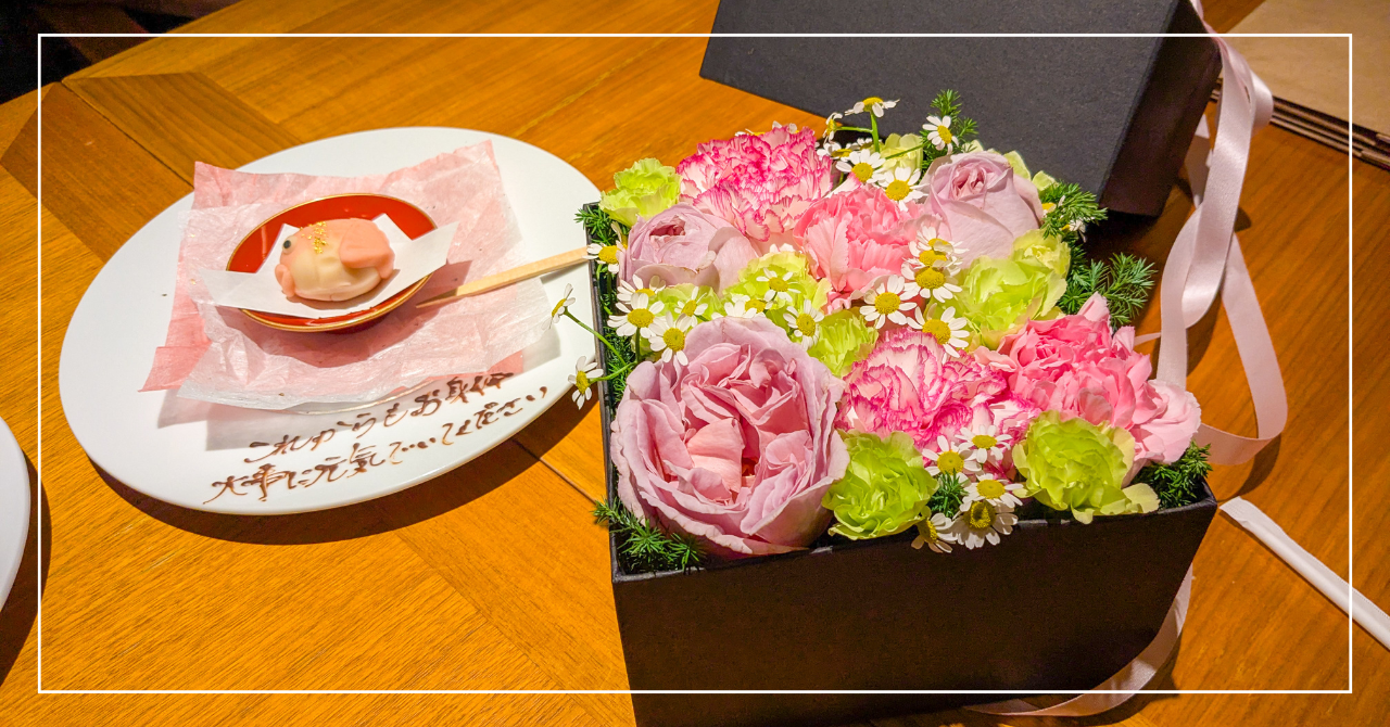 実は予約当時からスタッフの方へ還暦祝いであることを伝えておりました。その際花束、ケーキのご提案をいただきお願いしておりました。