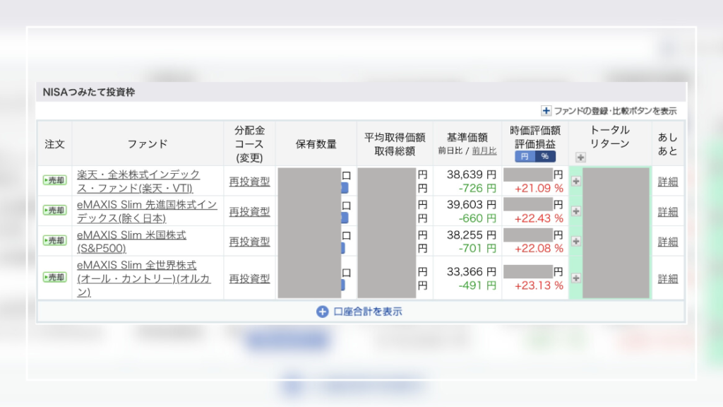 | eMAXIS Slim 米国株式(S&P500) | +20.93% | +13.00% | +25.30% | +21.79% |